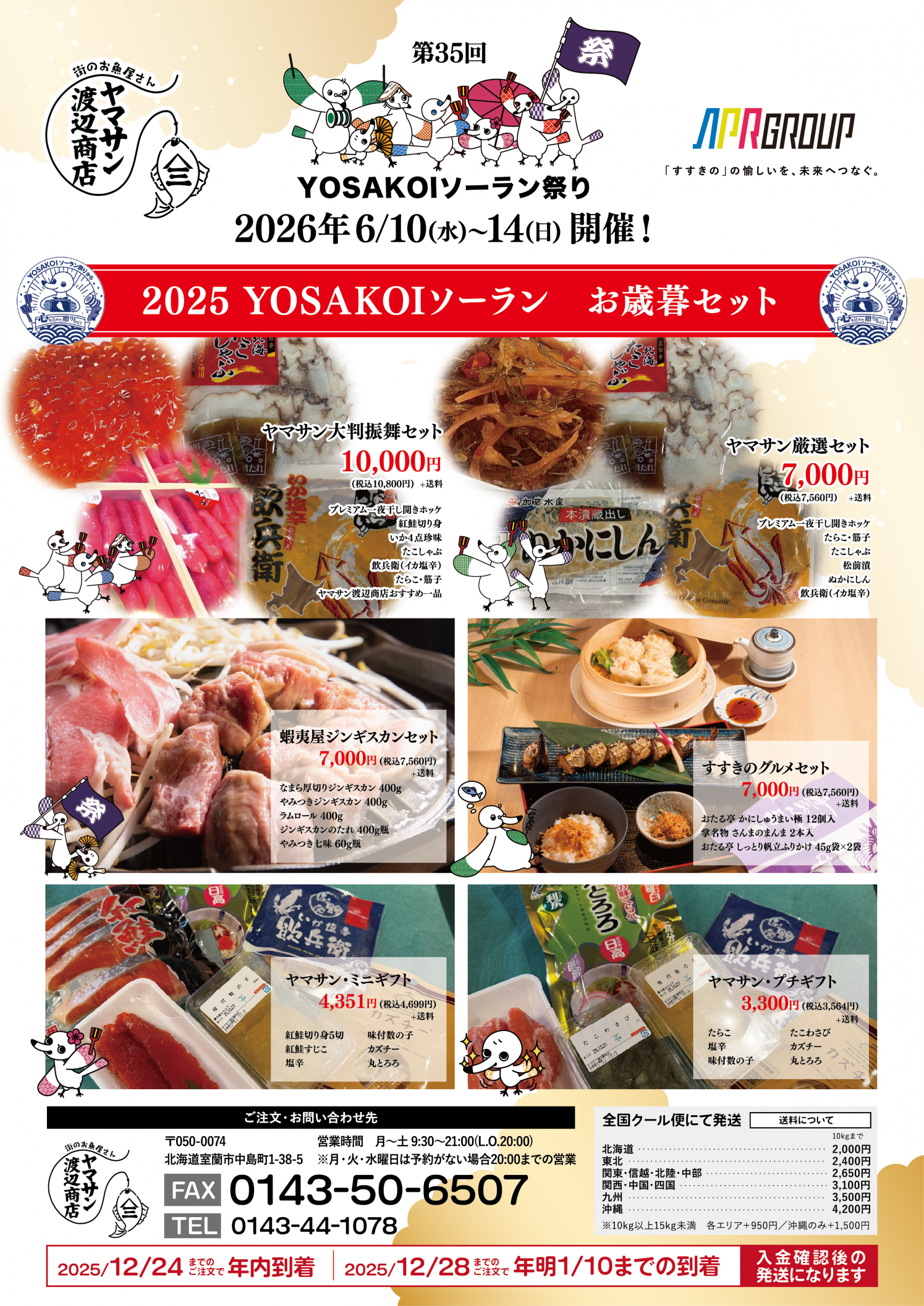 室蘭の「ヤマサン渡辺商店」、そして札幌「北海道ジンギスカン蝦夷屋」等とのコラボレーションで、今年もYOSAKOIソーラン祭りお歳暮セットを企画いたしました。新鮮な海産物やジンギスカンなど、北海道の魅力たっぷりの商品を選べる価格帯でご用意!お世話になった方に、最近お会いしていない方にも、一年の感謝を伝えませんか?ぜひYOSAKOIソーラン祭りオリジナルお歳暮セットをご活用ください!